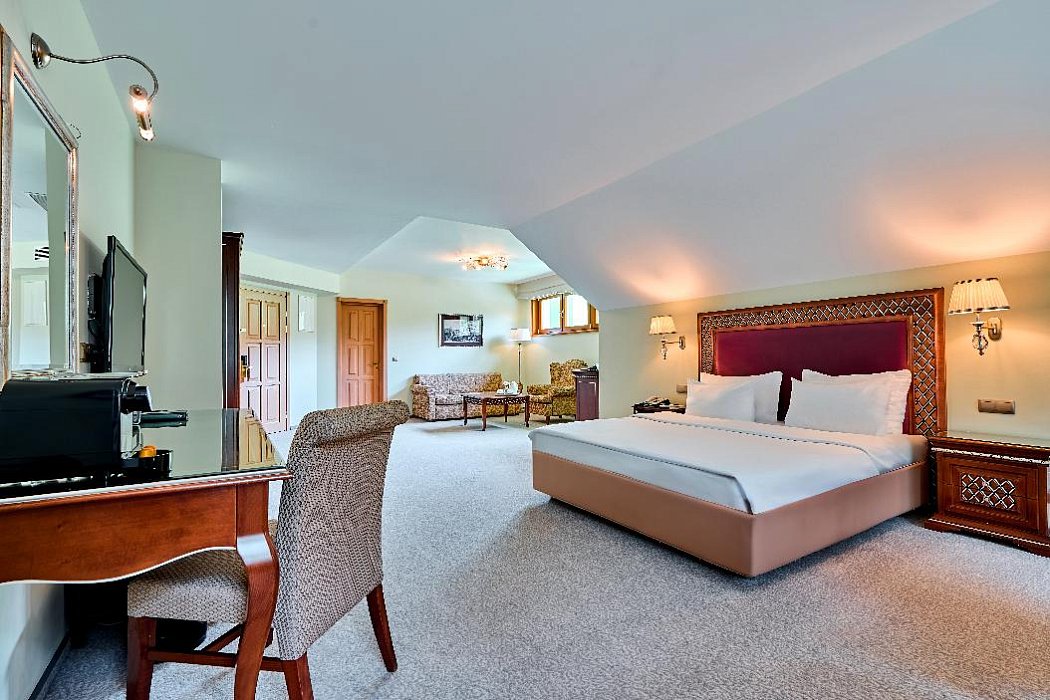 Виллы «Гранд Отель Поляна» одновременно сочетают в себе уют домашней обстановки и максимальный комфорт курортной жизни. Количество спален позволит прекрасно и беззаботно провести время большой семье или компании друзей. Виллы оборудованы 5 спальнями, отдельными ванными комнатами, 2 гостиными, просторной кухней и сауной.