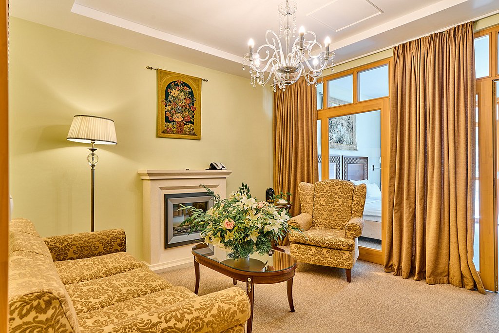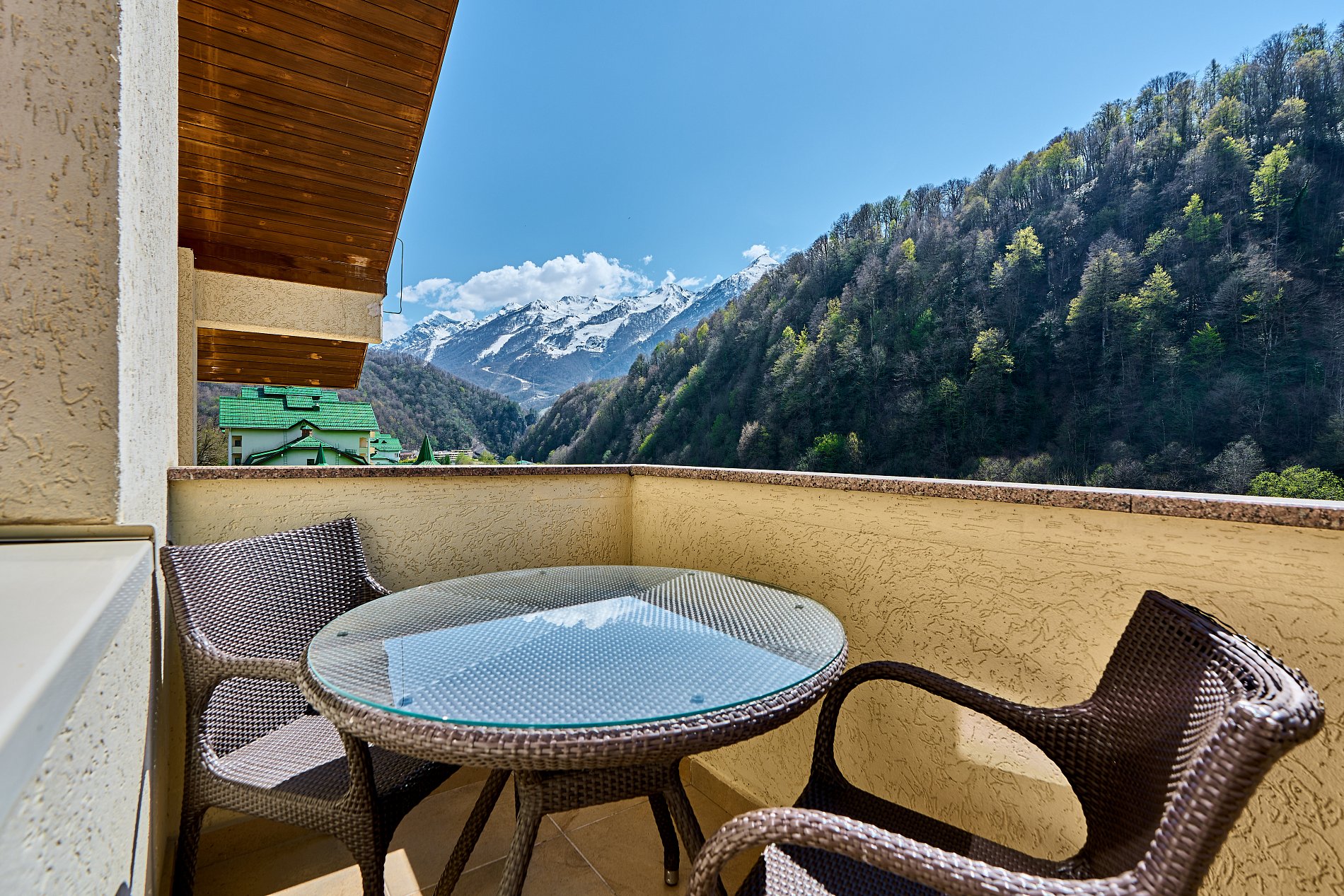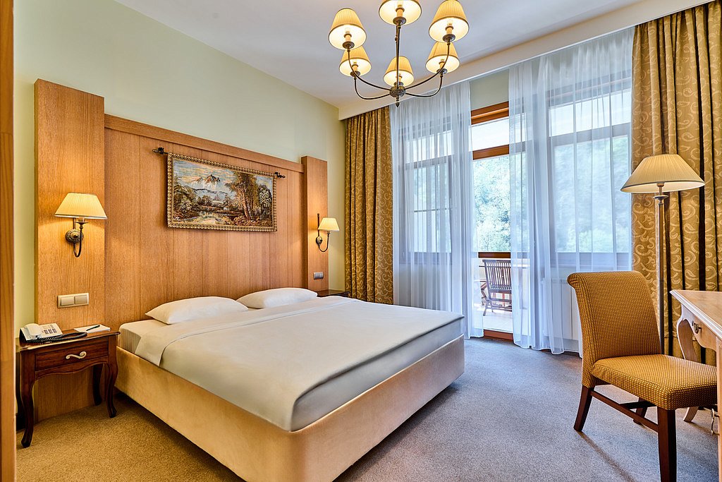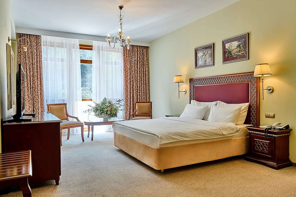 Особая категория номера люкс в корпусе С «Гранд Отель Поляна». Просторная спальня и уютная гостиная, вместительная гардеробная и собственный балкон.