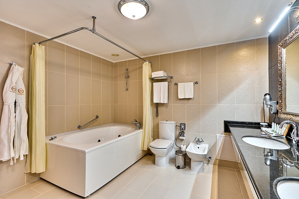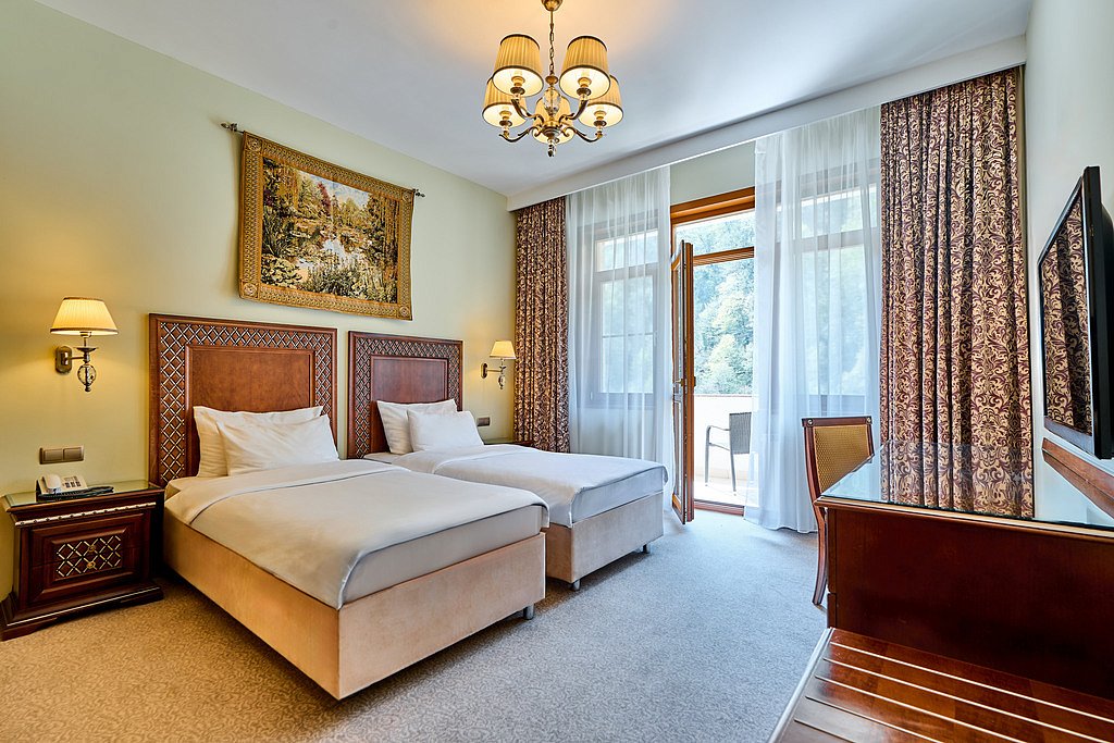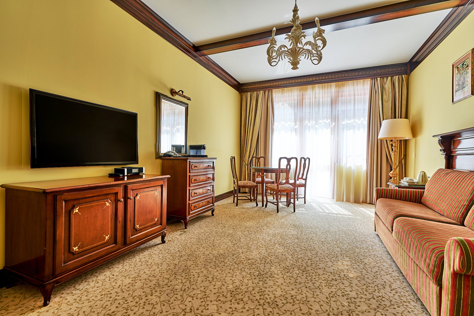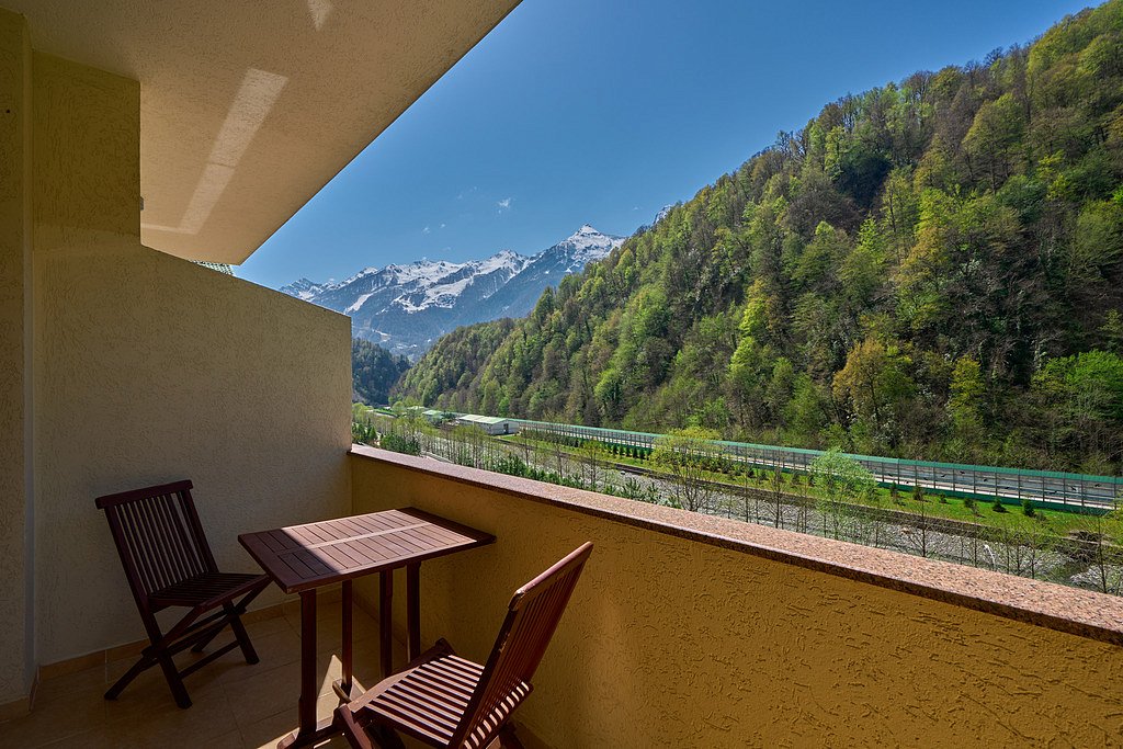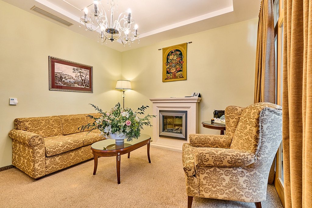 Особая категория номера люкс в корпусе С «Гранд Отель Поляна». Просторная спальня и уютная гостиная, вместительная гардеробная и собственный балкон.