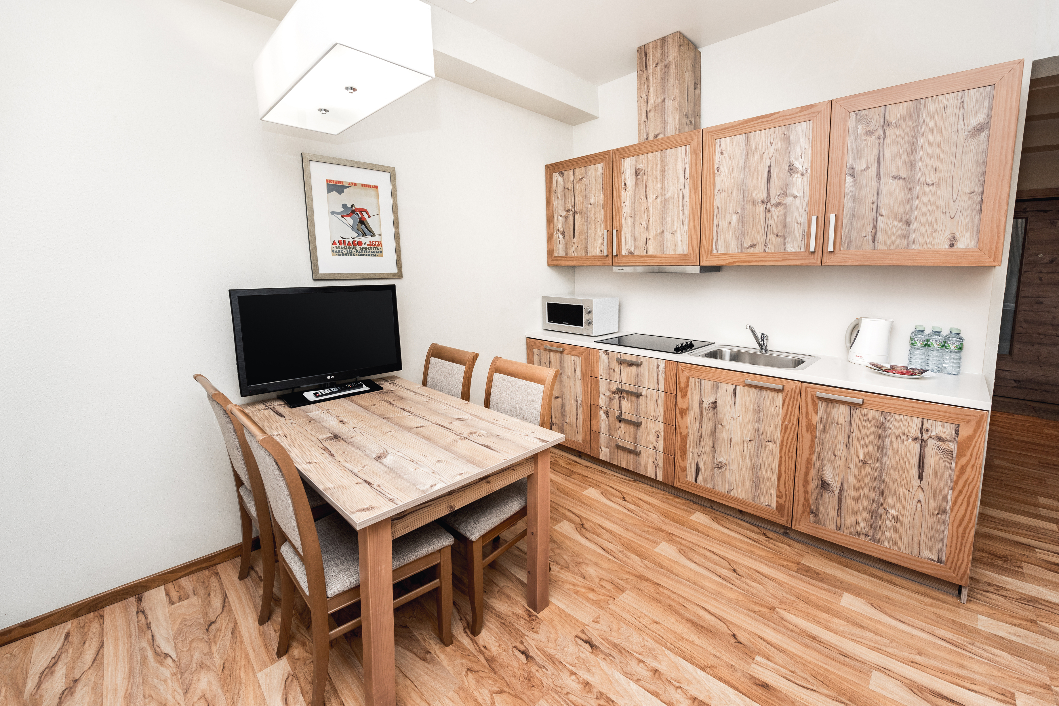 Апартамент состоит из двух спальных комнат и кухонной зоны.