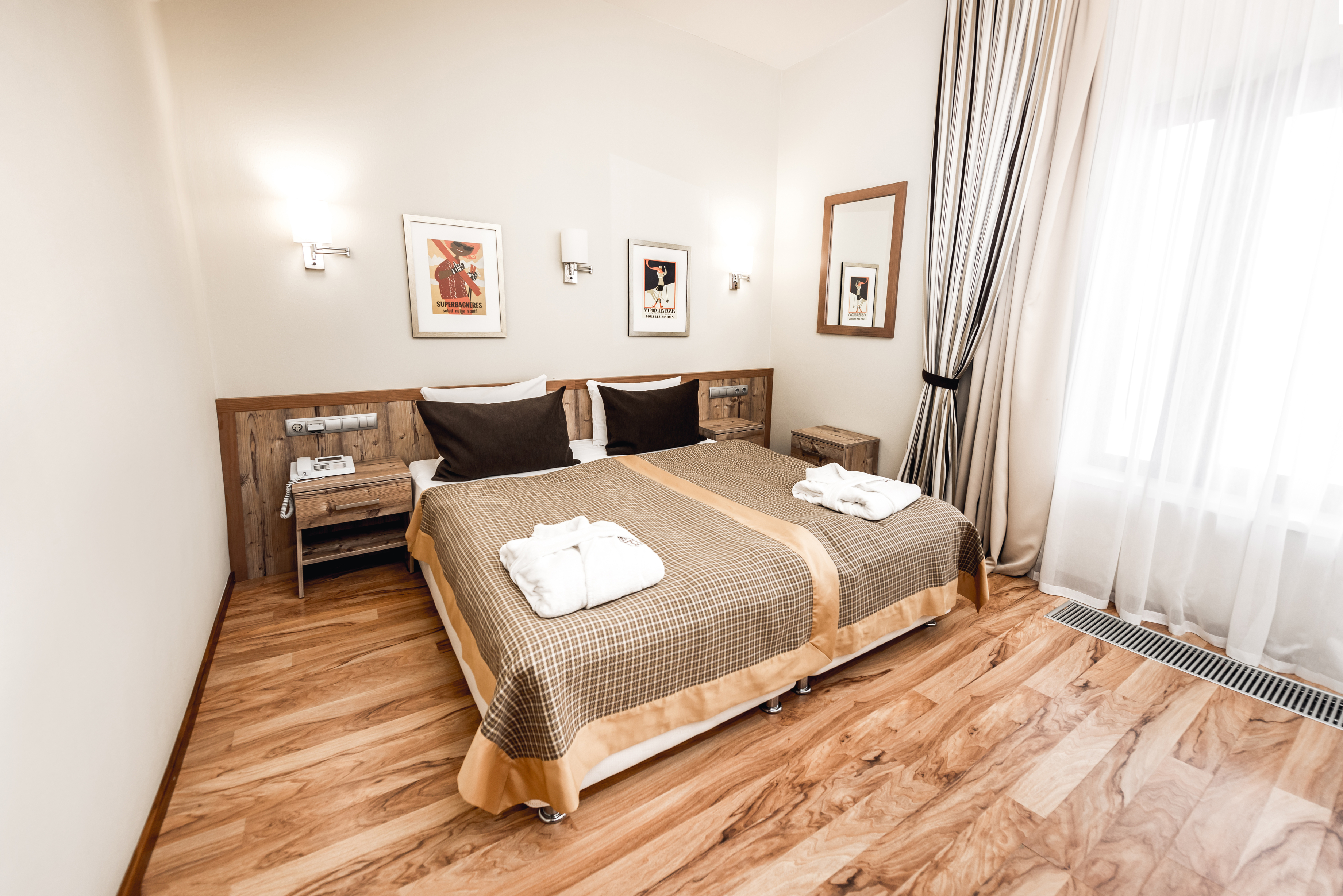 Просторная спальня, декорированная изящными светильниками из кованого железа. Номер оборудован широкой двуспальной кроватью или двумя односпальными.