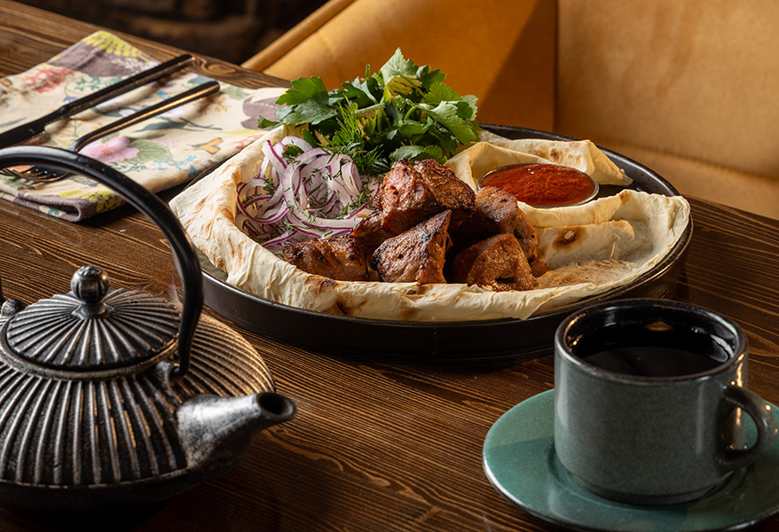 В основе — локальные продукты: свежая зелень, мясо, сыры.